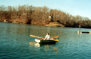 The gunwales and seats are solid wood. Exterior hull color can be Whalebone, Snosquall White, Deep-sea Blue, or Forty-Fathom Green with a waterline and covestripe color of your choice. Interior hull color is Scallop Shell Tan.